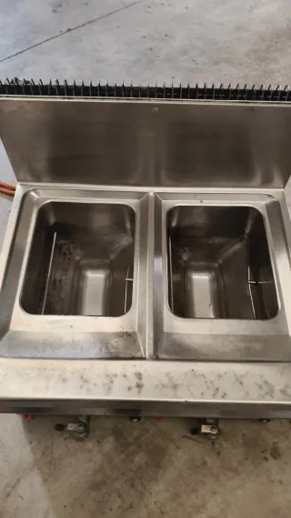 Freidora de gas de la marca Repagas con dos cubas de 17 litros cada una. - Dos cubas de 17 litros. - Medidas Ancho 80 Alto 85 Fondo 90 Nos encontramos en Almoradí Posibilidad de translado haciéndose cargo el comprador de los gastos Teléfono seis seis dos dos siete cinco cinco ocho cinco