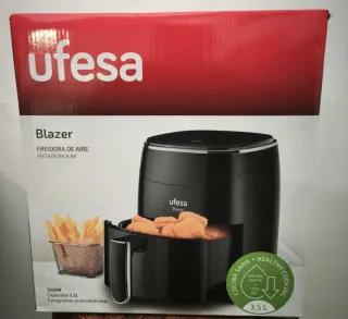 Freidora de aire Ufesa Blazer en color negro. Cuenta con una capacidad de 3.5 litros y una potencia de 1200W. - 9 programas preestablecidos. - Cocina saludable con menos aceite. En su caja, sin desprecintar