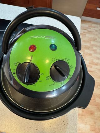 Freidora dietética Cecofry en color verde y negro. - Diseño moderno y compacto. - Asa superior para facilitar el transporte. - Dos diales para control de temperatura y tiempo. - 5 litros de capacidad
