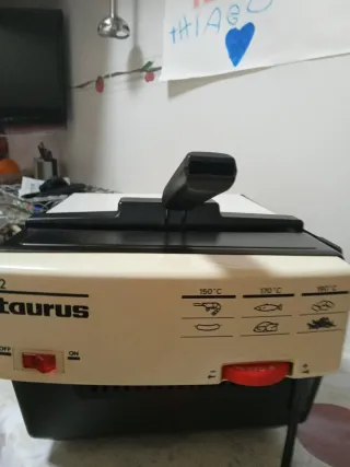 Freidora Taurus en buen estado. - Indicadores de temperatura: 150°C, 170°C, 190°C. - Indicaciones para freír gambas, salchichas, pescado y pollo. - Interruptor de encendido/apagado.