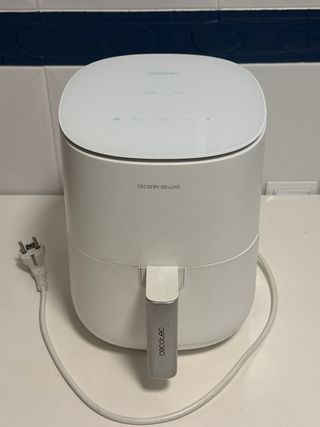 Freidora de aire Cecofry Deluxe de Cecotec. Diseño moderno y compacto. 2 años de uso, funciona perfectamente. - Color blanco. - Asa extraíble para cesta. - Panel de control táctil. - Falta rejilla del cestillo