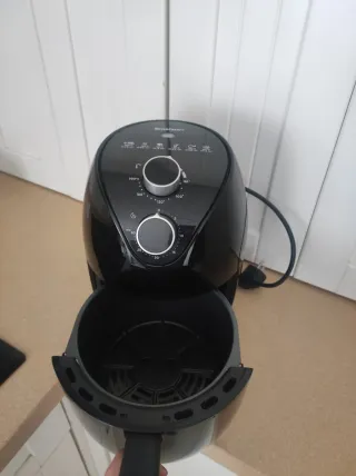 Freidora de aire en color negro, con una capacidad de 2.5 litros. Se encuentra en excelente estado, prácticamente sin uso. - Diseño compacto y moderno. - Asa de color dorado. - Temporizador con dial.