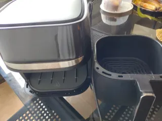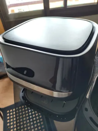 Freidora de aire Ufesa Blazer con capacidad de 3.5 litros. - Diseño digital. - Potencia de 1200W. Funciona perfectamente, las marcas del plato son porque al principio la usábamos sin poner papel de cocina y al limpiarla frotábamos. Para 2-3 personas está genial.