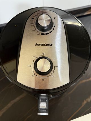 Freidora de aire Silvercrest en color negro. Cuenta con un diseño moderno y elegante. - Dos mandos giratorios en la parte superior. - Asa plateada para extraer la cesta.