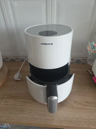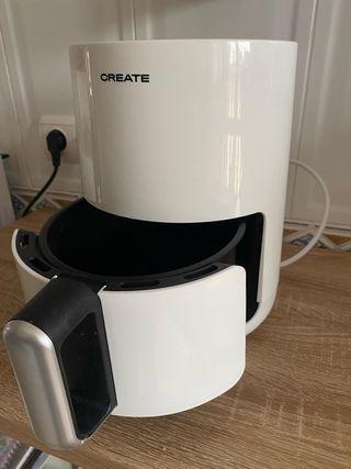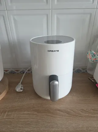 1.5 L Freidora de aire de la marca CREATE en color blanco. Su diseño cilíndrico y moderno se adapta a cualquier cocina. - Asa plateada y negra. - Tapa superior gris. - Cable de alimentación incluido.