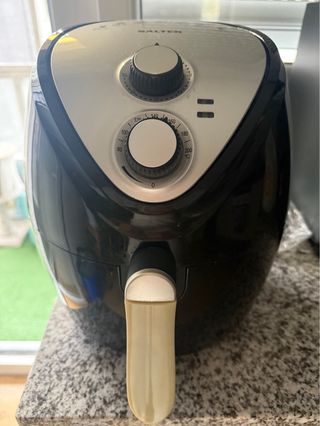 Freidora de aire marca Salter en color negro. Cuenta con dos diales para controlar el tiempo y la temperatura. - Dial de temperatura con rangos de 80°C a 200°C. - Dial de tiempo. - Asa extraíble para facilitar su uso.