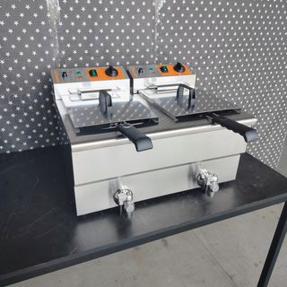 🍚👨🏾🍳 MAQUINARIA PARA ALIMENTACIÓN Y HOSTELERÍA Freidora Industrial Eléctrica Doble 8+8 Litros con grifo de desagüe en modelo sobremesa de la marca Caterina. 🎛️ Medición 61x51x39 cm 💡🚦 Seña: carcasa de Acero. Termostato seguridad. Sistema zona fría. Cesta sólida y tapa equipada con asas resistentes. Panel de control extraíble. Peso: 16 Kg Potencia: 6 Kw Voltaje: 230 V. 🚛 Entrega 48-72 horas 📦 Portes Gratis ☘️ 684760836