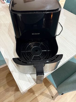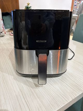 Freidora de aire con acabado en acero inoxidable y negro. - Diseño moderno. - Asa frontal para extracción. - Marca: Küken.