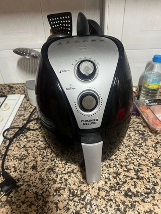 Freidora de aire Cecotec en color negro. Cuenta con dos mandos giratorios para ajustar la temperatura y el tiempo. Tiene capacidad para 1,5 litros. Le faltan los números que indican el tiempo y la temperatura pero la temperatura llega hasta los 200º y el tiempo hasta 30 min. Funciona perfectamente. Tiene un pequeño desgaste en la bandeja como se ve en la imagen pero eso no toca la comida ya que, sirve para el recipiente donde cae el aceite que se le hecha a la comida.
