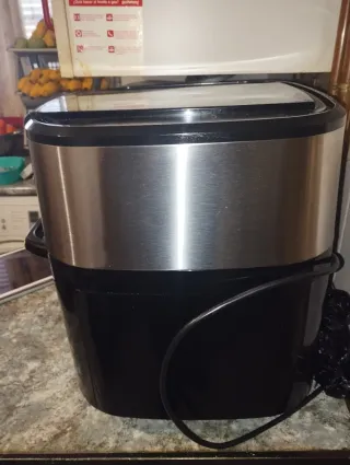 Freidora de aire en color negro, con panel de control digital. - Diseño moderno y compacto. - Asa plateada para extracción. - Panel con iconos de programas. - Marca: SAN IGNACIO Usada 3 veces contadas