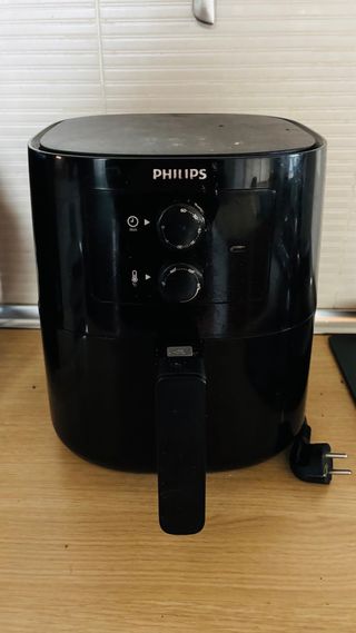 Freidora de aire marca Philips en color negro. - Diseño compacto y moderno. - Dos mandos giratorios para control de tiempo y temperatura. - 4.1 L