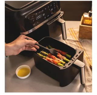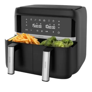 En su caja.Usada en 3 ocasiones.Se regalan los moldes de silicona de los cestillos.Freidora de aire Cecotec, Freidora sin Aceite 9 L de Aire Caliente Cecofry Advance Double. 2850 W, Dietética, Compacta y Digital, 2 Cestillos con Temperatura dual y Tecnología PerfectCook, Temporizador Cecofry Advance Double con dos cestas independientes para cocinar diferentes alimentos a la vez. - Doble cesta. - Diseño moderno en color negro. - Pantalla digital con controles táctiles.