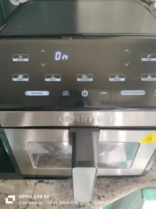 Freidora de aire Gourmia con panel de control digital. La vendo porque un lateral no cierra bien pero sigue funcionando. MIRAR LAS ÚLTIMAS FOTOS Donde he notado que no sube bien son los bizcochos. Por lo demás está en perfecto estado. - Funciones: Air Fry, Roast, Bake, Dehydrate, Reheat, Keep Warm. - Botones: Preheat, Stop/Cancel, Start, Turn Reminder. - Pantalla digital con indicador 'On'.