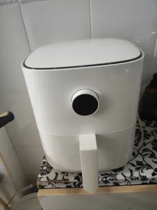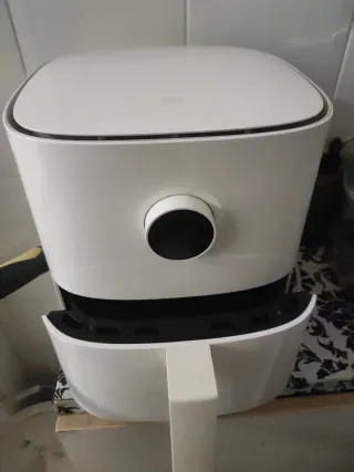 Freidora de aire en color blanco, con un diseño moderno y compacto. - Panel frontal con dial. - Asa extraíble para el cajón. - Se vende por no usarla.