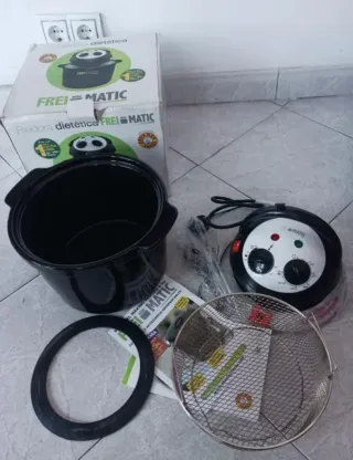 Freidora dietética de la marca Frei Matic, ideal para cocinar de forma saludable. Puede hornear o freir, con capacidad de 5L. - Diseño compacto y moderno. - Permite cocinar con solo una cucharada de aceite. Incluye recetario de comidas y manual de uso, cestillo con rejilla, pala de nylon y base aislante de silicona. Es muy completa.