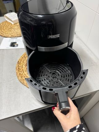 Freidora de aire Princess de color negro con capacidad de 3,2 litros. Cuenta con pantalla digital y panel de control. Usada pero en perfecto estado