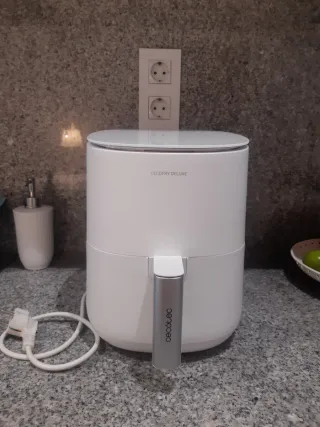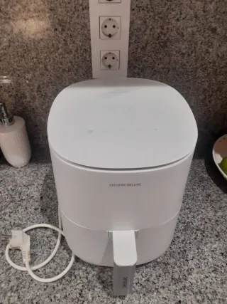 Freidora de aire Cecofry Deluxe en color blanco. Diseño moderno y compacto para tu cocina, funciona perfectamente como el primer día. En cada uso siempre se a protegido la bandeja con papel especial de fredioras de aire de usar y tirar o con un molde de silicona.