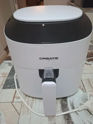 Freidora de aire de la marca CREATE en color blanco. Diseño moderno y compacto. - Asa extraíble para facilitar su uso. - Acabado en blanco y negro.