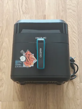 Freidora de aire Cecofry Fantastik 5500 de Cecotec. Con capacidad XL de 5,5 litros, pantalla digital táctil y 1300 W de potencia. Con 9 modos automáticos (pollo, patatas, pizza, etc.), Fácil de limpiar, cesta antiadherente apta para lavavajillas. Dimensiones aproximadas: 29 x 36 x 29 cm. Precio nueva: 79,90€ Incluye manual. Comprada en diciembre de 2024, con muy poco uso.