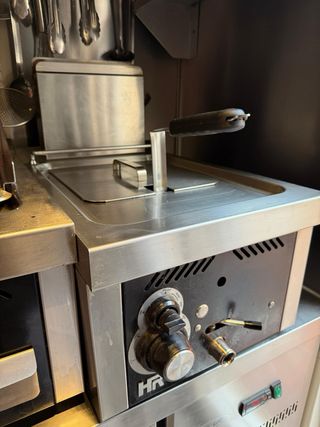 Freidora industrial de gas HR de 8 litros, en buen estado. Ideal para negocio de hostelería. - Marca: HR - Capacidad: 8 litros - Gas - Material: Acero inoxidable - Hace menos de un mes se le realizo mantenimiento . Se vende por poco uso .