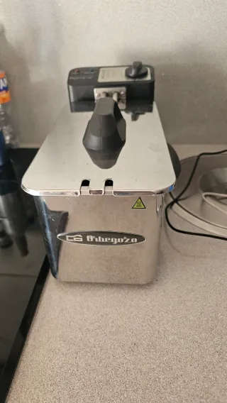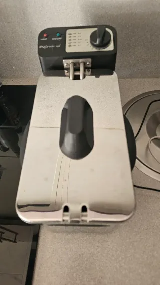 Freidora pequeña de aceite, ideal para espacios reducidos. Está en buen estado, aunque muestra señales normales de uso. - Capacidad pequeña. - Cesta extraíble de rejilla metálica. - Control de temperatura.