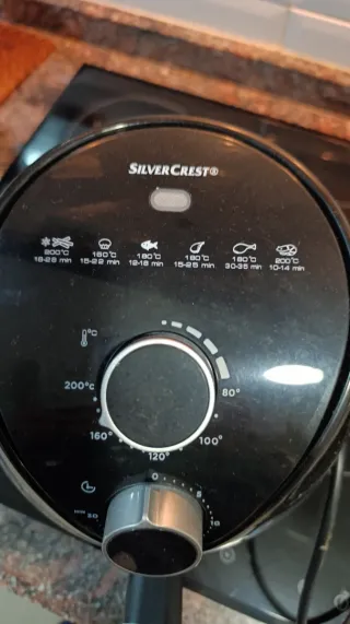 Freidora de aire Silvercrest en color negro. - Diseño moderno y compacto. - Panel de control con diales para temperatura y tiempo. - Cesta extraíble para facilitar la limpieza.