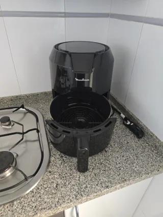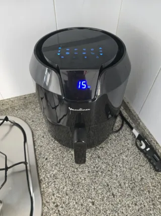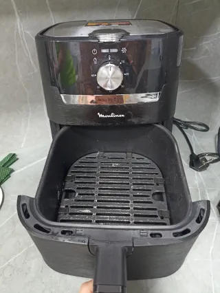 Freidora de aire Moulinex en color negro con acabado texturizado. Cuenta con un panel de control superior con dial y botones. - Diseño moderno. - Asa frontal plateada. Tiene 1 año de uso. Ya véis como está. Se puede lavar en lavaplatos la cajetilla y rejilla.