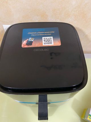 Freidora de aire Cecotec en excelente estado, casi sin uso. Fue un regalo. - Diseño moderno en color negro con detalles en azul. - Incluye asa para extracción de la cesta. - Pegatinas con códigos QR para acceder a la app y recetario.