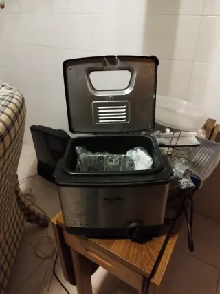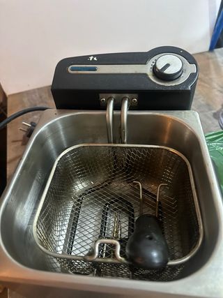 Freidora eléctrica de acero inoxidable con control de temperatura. - Diseño compacto y moderno. - Asa extraíble para facilitar la limpieza. - Indicadores luminosos de encendido y calentamiento. Fácil de limpiar se desmonta totalmente. Utilizado en tres ocasiones. Filtros son los originales que vinieron con freidora, en perfecto estado.