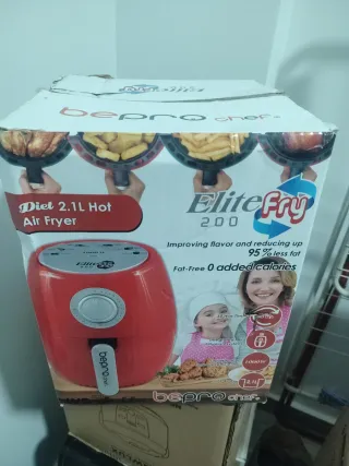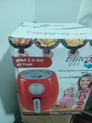Freidora de aire Bepro Chef Elite Fry 200, con capacidad de 2.1L. Diseñada para mejorar el sabor y reducir la grasa. - Capacidad: 2.1 Litros - Potencia: 1000W - Menos grasa: 95% menos grasa - Sin calorías añadidas: Fat-Free 0 added calories - Temporizador: 30 min