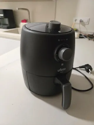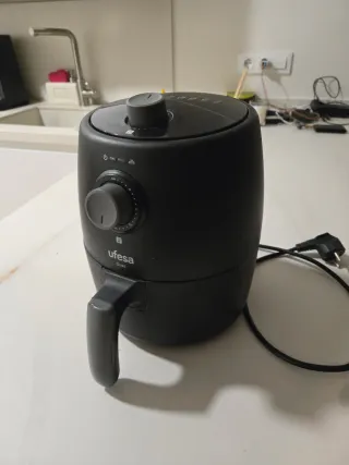 Freidora de aire Ufesa en color negro. Cuenta con un diseño compacto y moderno, ideal para tu cocina. - Mandos giratorios para ajustar tiempo y temperatura. - Asa para extraer la cesta. - Indicadores luminosos de encendido y funcionamiento. - Como nueva, ideal para cocinar para 2 personas y ensuciar lo menos posible. - Este modelo nueva ronda los 45€. OPORTUNIDAD!!
