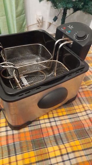 Vendo freidora Jata FR700 totalmente nueva, poco uso, de 4 litros de capacidad, fabricada en acero inoxidable y con doble cestillo más cestillo grande incluido. Modelo muy completo, potente y fácil de limpiar. Incluye: • ✅ 2 cestillos medianos de 12,5 x 20 cm • ✅ 1 cestillo grande de 27 x 22 cm (equivale a los dos medianos juntos) Perfecta para freír dos alimentos distintos a la vez o grandes cantidades de una sola vez. • Jata FR700 • 4 litros • Potencia: 2000 W • Material: Acero inoxidable • 52,5 x 38 x 23,5 cm (aprox. 4,1 kg) resistencia inox, temperatura regulable, sistema Cool Zone (no mezcla sabores), filtro lavable