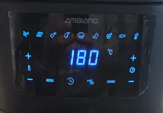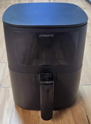 Freidora de aire de la marca Ambiano en color negro. - Panel de control táctil con iconos. - Asa ergonómica para extracción. La hemos usado apenas y nos ocupa espacio.