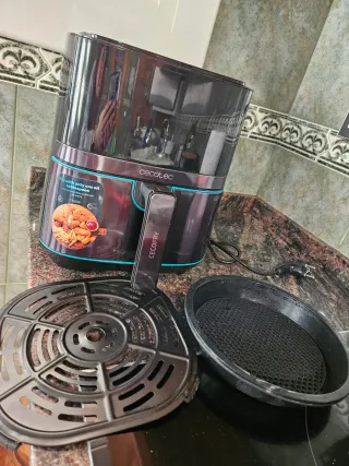 Freidora de aire Cecotec (Cecofry) en acabado metálico. - Diseño moderno y compacto. - Con sus accesorios originales. - Varios programas para cocinar lo que necesites. - 5.5 L - 1700W Usada poco, para descongelar pan básicamente. Funciona perfectamente.
