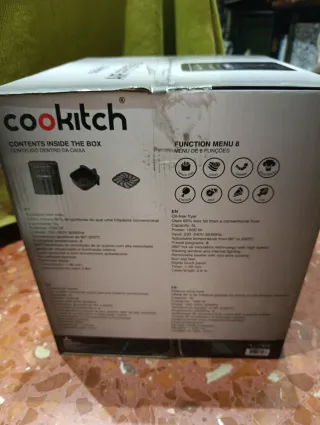 Freidora de aire Cookitch de 5 litros, completamente nueva. - Potencia de 1500W. - Rango de temperatura de 80°C a 200°C. - Temporizador de hasta 60 minutos. - Ventana para ver el interior. - Panel de control digital táctil. - 8 programas predefinidos.