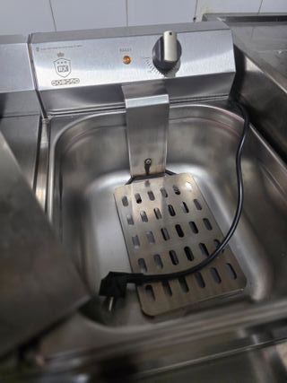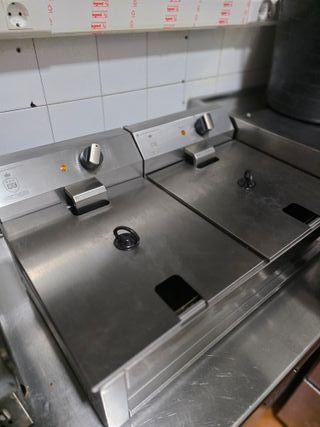 Freidora eléctrica de doble cuba en buen estado. Fabricada en acero inoxidable, es robusta y fácil de limpiar. - Dos cubas independientes. - Construcción en acero inoxidable.