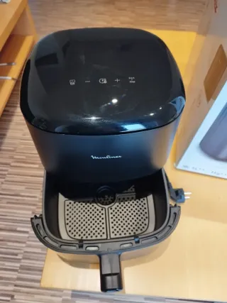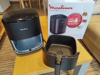 Freidora de aire Moulinex Easy Fry Max en color negro. - Diseño compacto y moderno. - Cesta extraíble que se puede lavar en el lavavajillas. - Nueva, sólo tiene 3 usos literalmente. - Funciona a la perfección. - Conserva su embalaje original, libro de instrucciones y de seguridad. - Muy sencilla y cómoda.