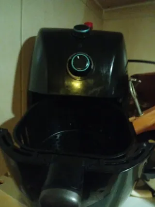 Freidora de aire en buenas condiciones. - Color negro brillante. - Diseño compacto y moderno. - Asa ergonómica para fácil manejo.
