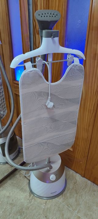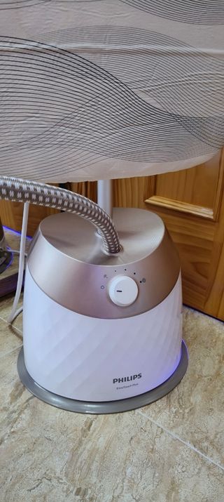 Plancha vertical Philips EasyTouch Plus en color blanco y dorado. Ideal para alisar la ropa de forma rápida y eficaz. - Diseño moderno y elegante. - Manguera flexible para mayor comodidad.