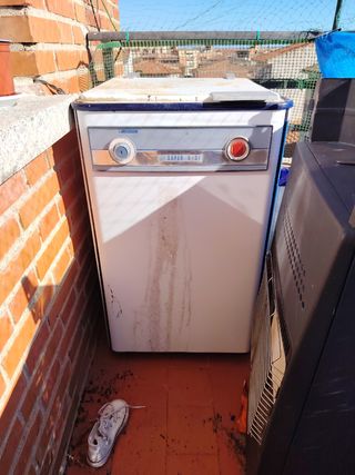 REGALO!! SOLO RECOGIDA EN FUENSALIDA. HAY QUE BAJARLA DESDE UN TERCERO SIN ASCENSOR. NO PESA APENAS PERO ES MUY APARATOSA. Lavadora antigua de carga superior, modelo Super A-51. Un electrodoméstico con un diseño retro y un dial de tiempo. - Color blanco con detalles en azul. - Panel frontal con dial y botón rojo.