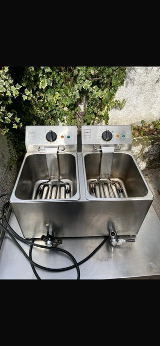 Freidora eléctrica de sobremesa para cocina industrial. Fabricada en acero inoxidable, cuenta con dos cubas independientes y grifos de vaciado. - Dos cubas de gran capacidad. - Termostato regulable. - Indicadores luminosos de encendido y temperatura. - Construcción robusta en acero inoxidable.