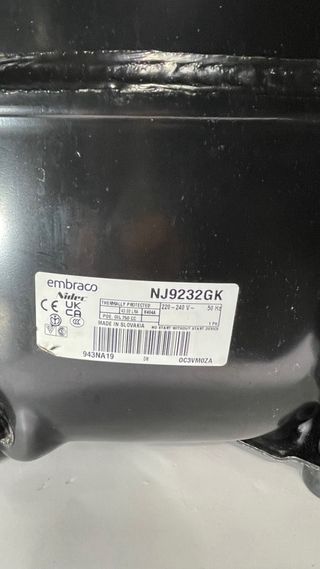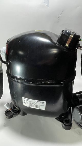Compresor Embraco modelo NJ9232GK. - Color negro. - Etiqueta con información del modelo y especificaciones técnicas.