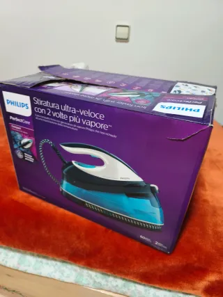 Centro de planchado Philips PerfectCare Compact en color azul y blanco. Diseñado para un planchado rápido y eficiente. - Planchado ultra-rápido. - Generador de vapor. - Compacto y fácil de usar.