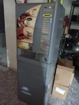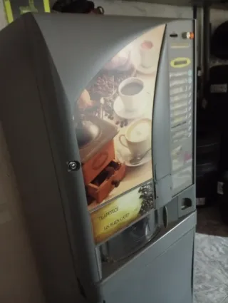 Máquina expendedora de café y otras bebidas calientes. Ideal para oficinas o negocios. - Diseño moderno en color gris. - Panel frontal con selección de bebidas. - Gráfica decorativa de café.