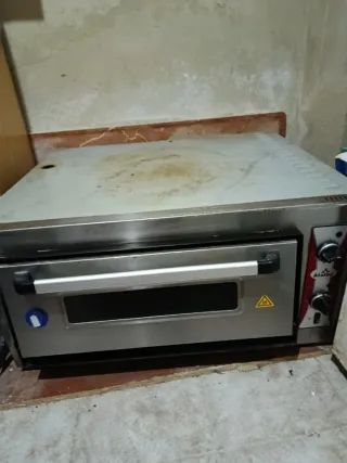 Horno profesional para pizzas, ideal para negocios de hostelería. - Fabricado en acero inoxidable. - Superficie de cocción de piedra. - Puerta con ventana para visualización. - Panel de control con mandos. - Marca: Atalay. -capacidad para 4 pizzas a la vez. -Enchufe trifásico. -Usado solo 3 meses