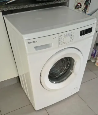 Lavadora ICECOOL modelo ICD106W. - Capacidad de carga de 6 kg. - Velocidad de centrifugado de 1000 rpm. - Programas de lavado variados, incluyendo Eco 40-60. - Pantalla digital. - Diseño moderno en color blanco.