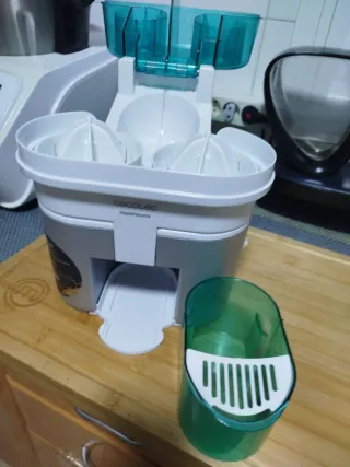 Exprimidor de la marca Cecotec, modelo Essentialita. Diseñado para facilitar la extracción de zumos. - Doble cono para diferentes tamaños de cítricos. - Depósito extraíble para zumo. - Piezas desmontables para una fácil limpieza. Ideal para estás fechas