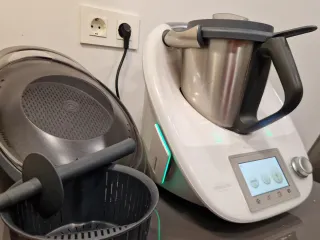 Robot de cocina Thermomix TM5. Incluye: -Vaso usado. -Vaso precintado a estrenar. -Cook Key para conectar tu Thermomix a internet via wifi y descargar tus recetas de cookidoo. -Varoma de dos pisos para cocinar al vapor. -Cesta y espatula que hace función de asa para la cesta. Funciona todo a la perfección aunque tenga alguna marca de uso como la marca de sarten que tiene en un lateral. El vaso es lo que mas signos de uso tiene pero hay otro sin sacar de la caja.