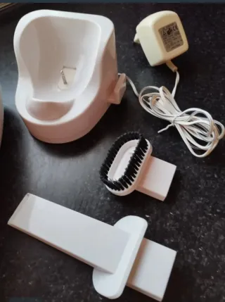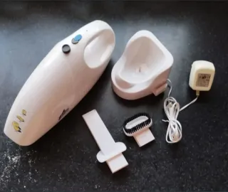 Aspiradora de mano en color blanco, ideal para limpiezas rápidas. Incluye varios accesorios para diferentes usos. - Base de carga. - Cepillo. - Boquilla. - Adaptador de corriente.