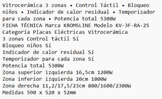 Vitrocerámica Kromsline KV-3F-RA-25 en buen estado. Cuenta con tres zonas de cocción. - Diseño moderno y elegante. - Fácil de limpiar.